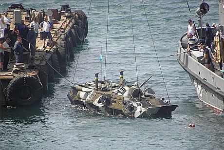 Все восторженно ждали, когда с корабля на воду выедут бронетранспортеры. Но долгожданная часть репетиции принесла неприятную неожиданность. Один из бронетранспортеров сначала отстал от колонны, а затем медленно ушел под воду - у него заглох мотор. Экипаж не пострадал - их вытащили спасатели. Машину же вытянул плавучий кран Черноморского флота России.