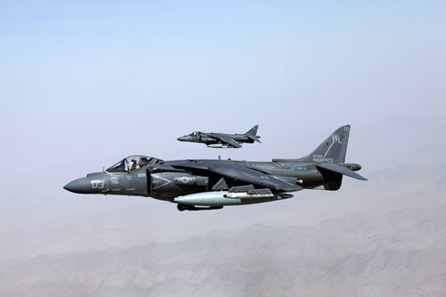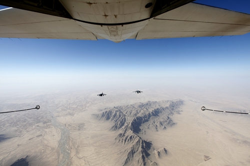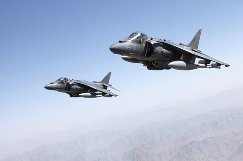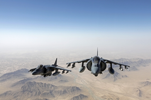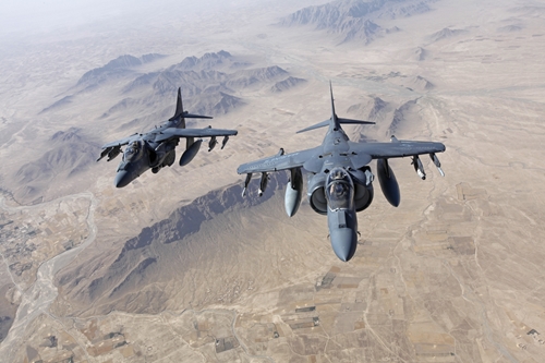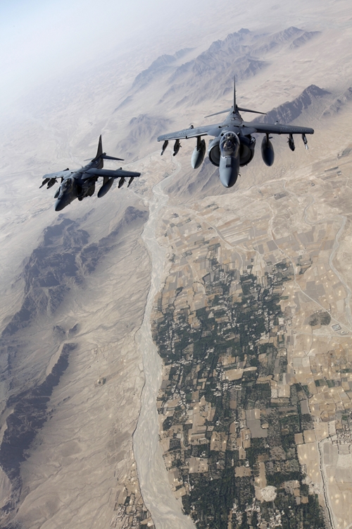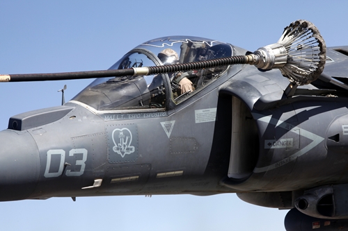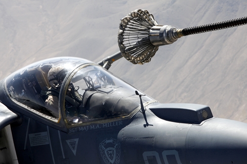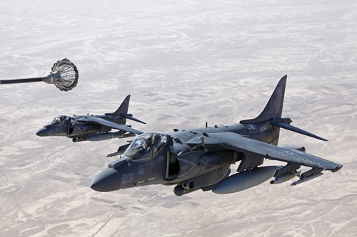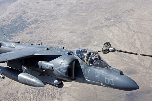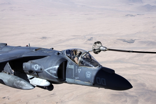 Штурмовики AV-8B "Харриер", 311ой эскадрильи корпуса морской пехоты США, осуществляли дозаправку в воздухе от самолета-заправщика KC-130J "Геркулес" над провинцией Гильменд в Афганистане, 10 июня 2013 года.