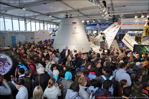 Фотографии, представленного на "МАКС-2013", полноразмерного макета пилотируемого транспортного космического корабля нового поколения (ПТКК НП), рассчитанного на комфортный полет 4х человек с большим запасом воды и продовольствия.