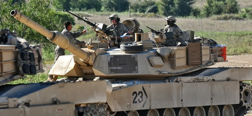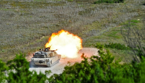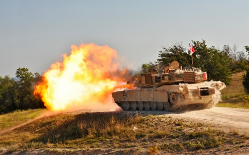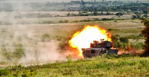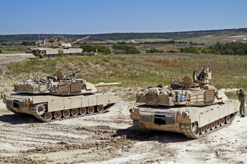 Танки M1A2 Abrams из 2-го танкового батальона армии США во время учений в Форт-Худ, штат Техас (23 сентября 2013 года). Во время маневров экипажи танков оттачивали свои навыки в стрельбе.
