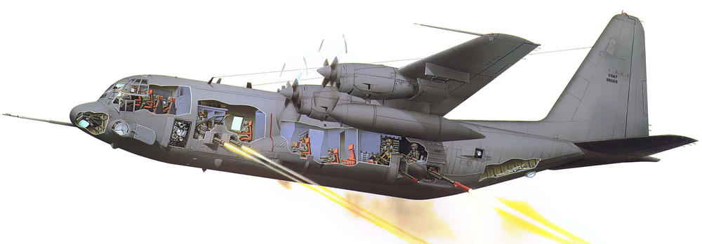 Однако следует заметить, что ВВС выделили на эти цели изрядно потрепанный "Геркулес". Его вооружили специально разработанными для "Ганшипов" модулями: четыре модуля MXU-470 ("Миниганы") и четыре 20мм пушки "Вулкан". На самолет поставили систему ночного видения, РЛС, обычно устанавливаемые на истребители F-104, аналоговую бортовую ЭВМ и мощные прожекторы.