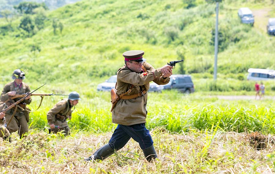 Около полусотни человек одетых в военную форму тех лет стреляли холостыми и дрались в рукопашном бою. В мероприятии участвовали и японские гости, которые для этого специально приехали в приморье.